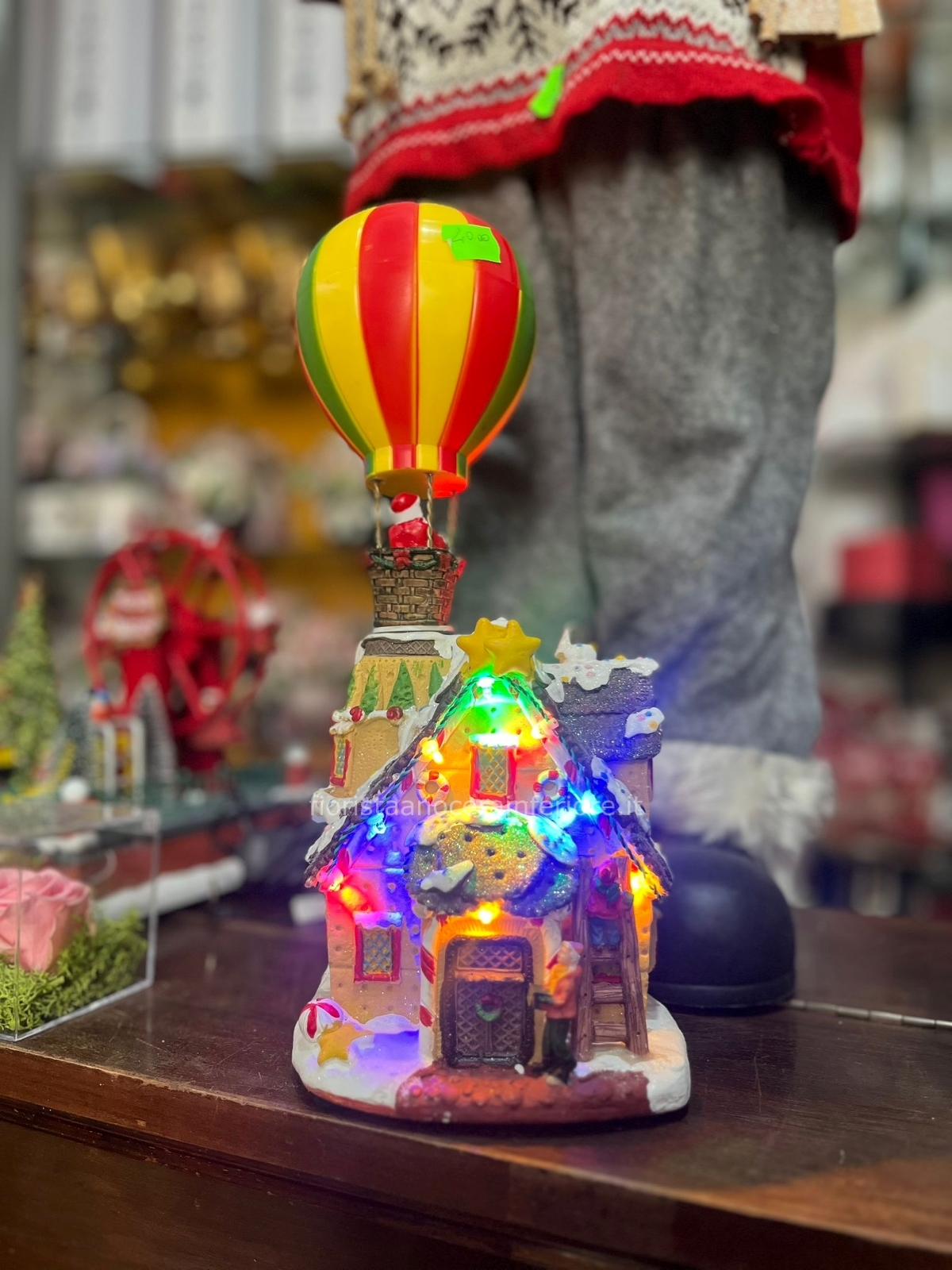 “Casetta delle Feste è una casetta natalizia in ceramica con illuminazione multicolore, impreziosita dalla presenza di Babbo Natale in mongolfiera. Un elemento decorativo elegante e suggestivo, ideale per arricchire l’ambiente con un’atmosfera calda, luminosa e ricca di spirito natalizio.