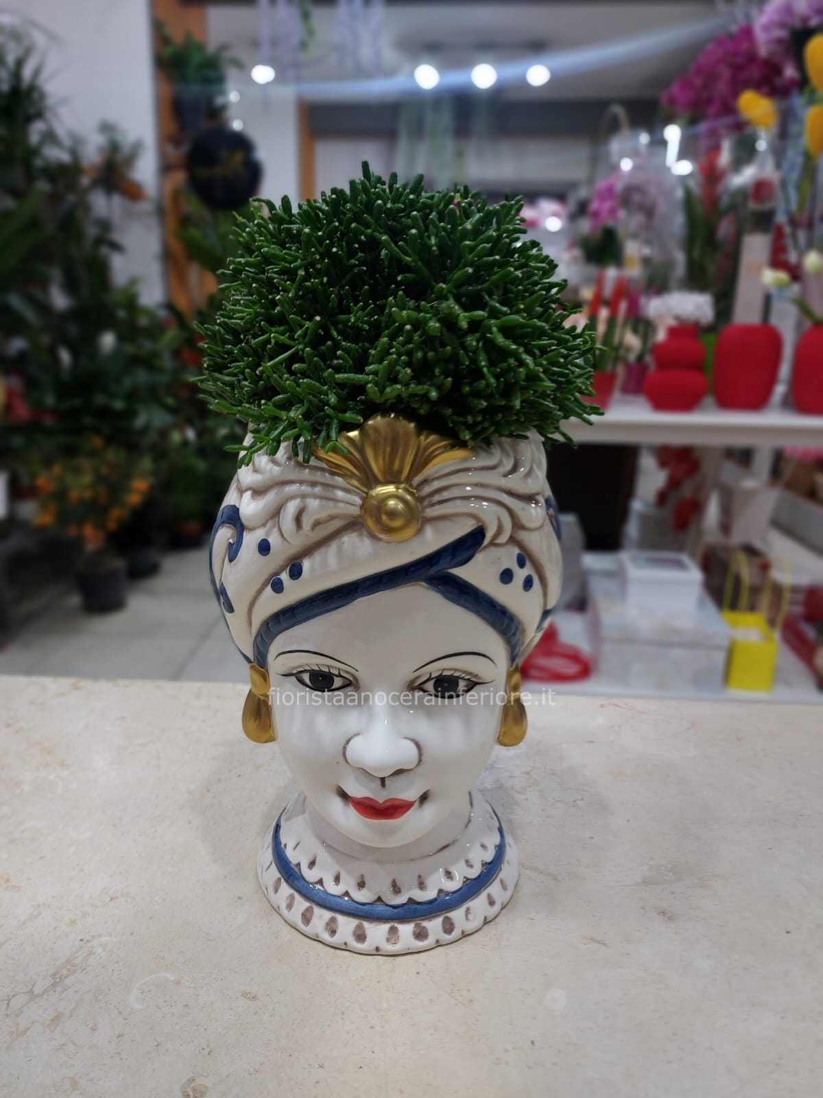 Un classico intramontabile dell'artigianato italiano. Questa Testa di Moro in ceramica artistica, decorata a mano nei toni del bianco, blu e oro, ospita una rigogliosa pianta di Rhipsalis (cactus corallo).